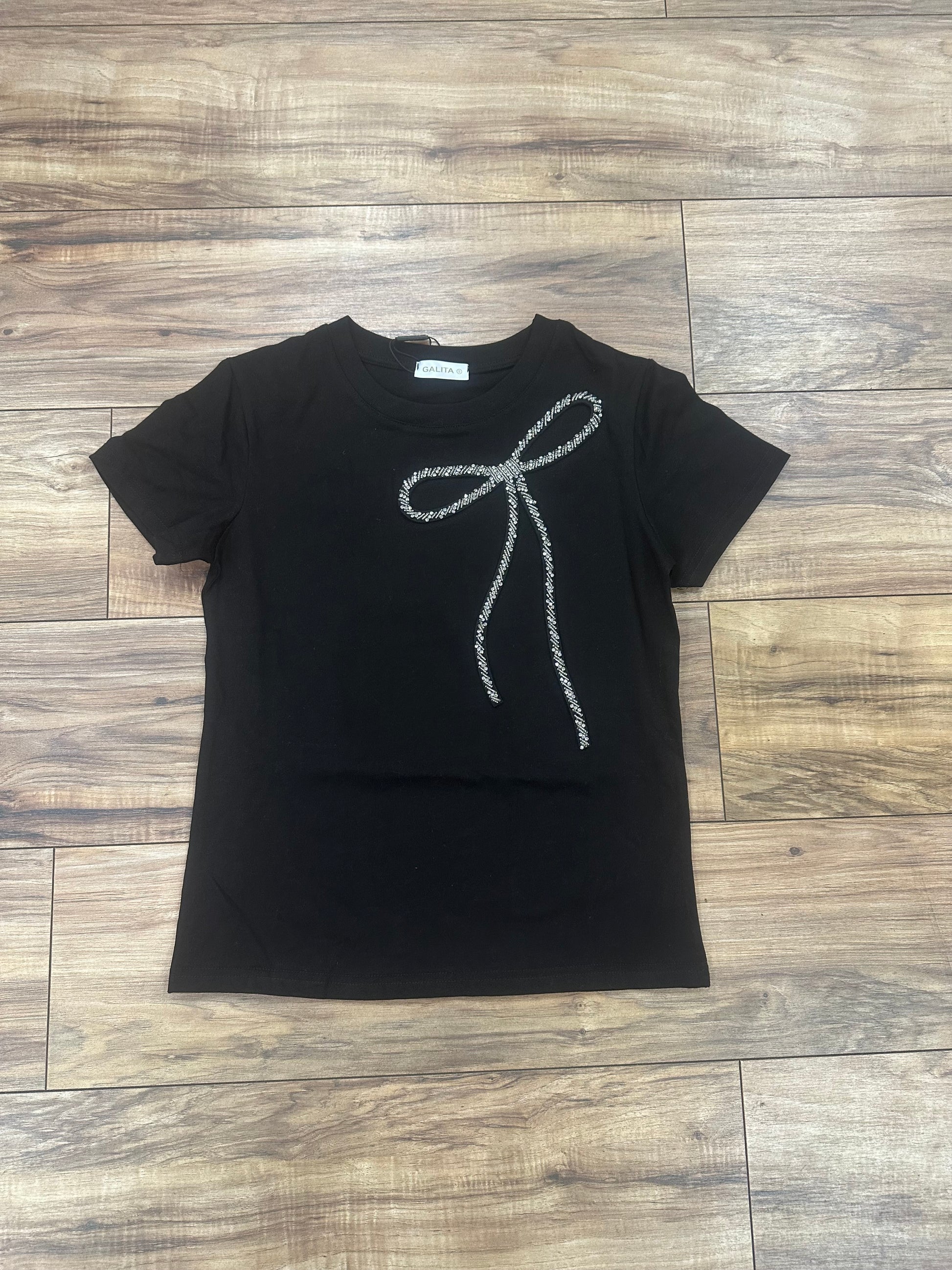 Keep it simple with a touch of sparkle. This classic black short-sleeve tee features a stunning rhinestone bow detail that adds just the right amount of glam. Made from soft, comfortable fabric with a relaxed fit, it’s perfect for dressing up your everyday look or pairing with jeans, skirts, or statement accessories. Effortless, chic, and easy to style—this top is a must-have.