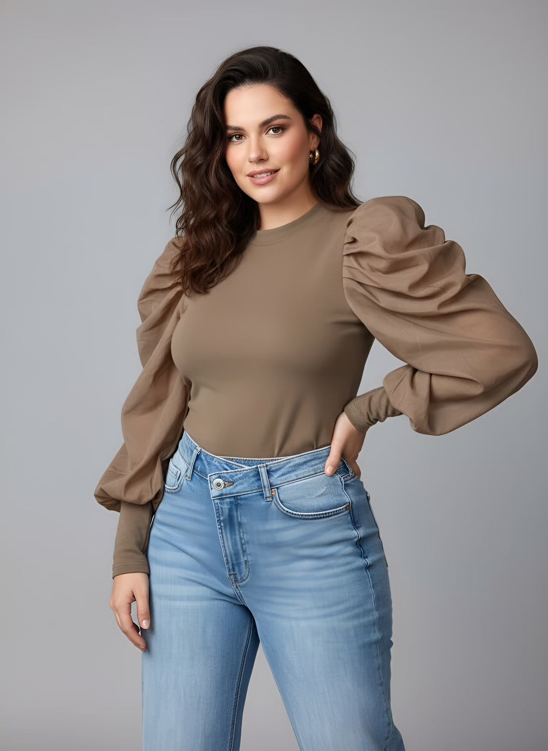 This long-sleeved puff-sleeve top that features a mock neck neckline and voluminous sleeves that gather at the cuffs.